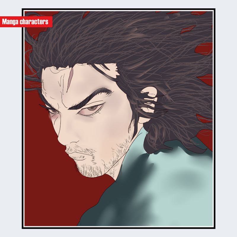 『バガボンド』に登場する宮本武蔵は、長く乱れた黒髪と鋭角的な目元を特徴とする擬人化構造のキャラクターである。髪は束状に外側へ流れ、頭部から肩にかけて自然な広がりを持つシルエットとなっている。顔立ちは細長い輪郭を基調に、濃い眉と切れ長の目が主要な視覚要素を形成している。頬や顎には短い無精髭のような線描が入り、肌の質感を強調する構造が確認できる。上半身は淡い青系の衣装で、肩から胸にかけて布がゆるやかに落ちる描写が見られる。