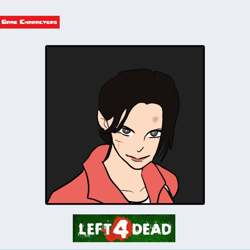 『Left 4 Dead(2008年)』に登場するゾーイは、黒髪を後ろで束ね、顔周りに数本の髪を垂らしたスタイルを持つ。衣装は赤いジャケットを羽織り、首元のジッパー部分が特徴的に描かれている。顔には傷跡が確認でき、サバイバーとしての戦闘的要素を示している。体格は細身で、他キャラクターのスーツやレザーベストと対比して、よりシンプルで若者的な服装が強調されている。これらは「現代装束型」「シンプル衣装構造」に分類される。
