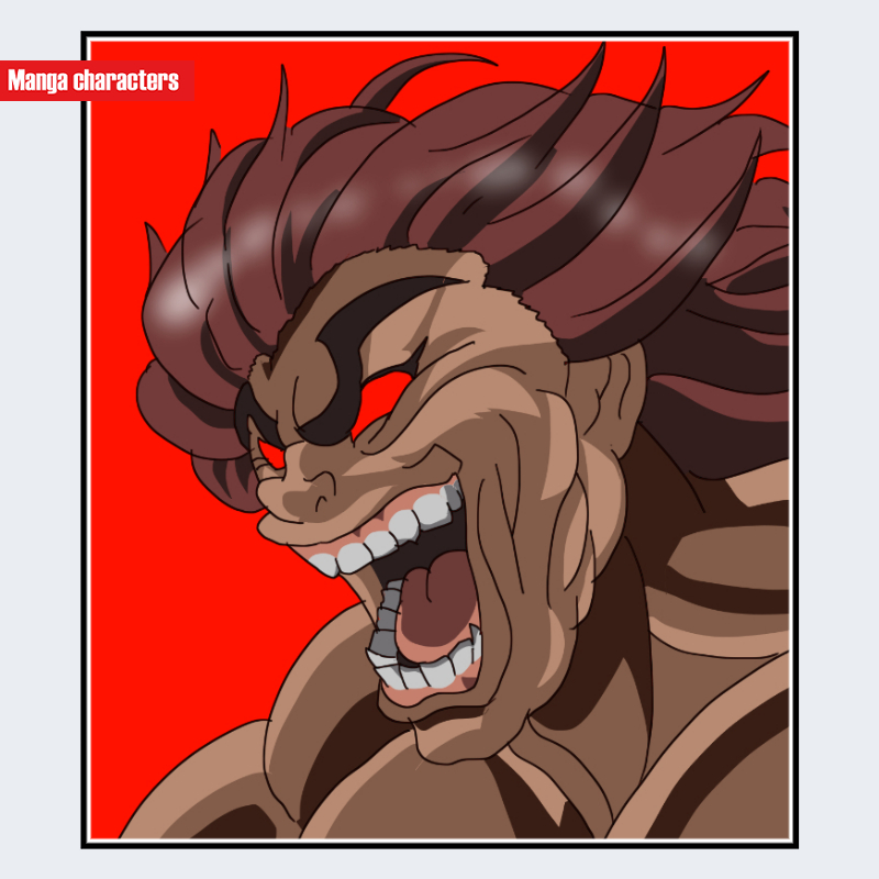 『グラップラー刃牙』に登場する範馬勇次郎は、極端に発達した筋肉構造と外側へ大きく広がる髪型を特徴とする擬人化構造のキャラクターである。髪は束状に膨らみながら後方へうねるように流れ、赤みを帯びた濃色で描かれている。顔立ちは彫りの深い輪郭と突出した頬骨が中心となり、口元は大きく開き鋭く並ぶ歯列が視覚的な支点となっている。首や肩回りには強調線が多数入り、上半身全体が筋繊維的パターンで構成されている。可視範囲は身体そのものの構造比率が大きく、髪型と筋肉表現の対比が造形の主軸を形成している。