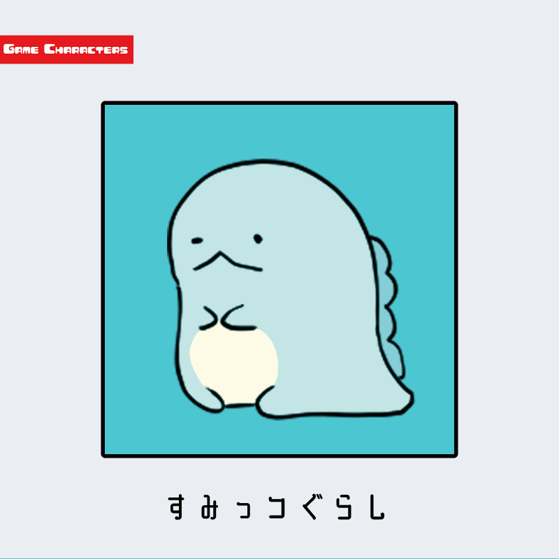 『すみっコぐらし(2012年)』に登場する「とかげ」は、淡い青色の体を持つキャラクターである。腹部は白色で楕円形の模様が描かれ、丸みを帯びたシルエットが特徴的である。背中には小さな突起状のヒレが連なり、恐竜を思わせるデザイン要素を持っている。顔は点状の目と短い線の口で構成され、手足は短く簡略化されている。全体として爬虫類的な形状を示しつつも、造形的には「擬獣化構造」として分類できる。