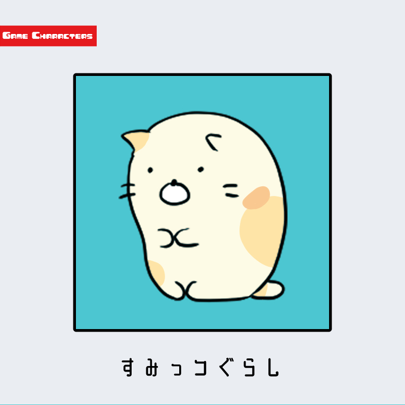 『すみっコぐらし(2012年)』に登場する「ねこ」は、淡いクリーム色の体に薄茶色の斑点が描かれたキャラクターである。耳は三角形で小さく、左右に配置されている。顔は丸みを帯びた輪郭で、目と鼻は点や短い線で簡略的に表現されている。ひげを示す線が頬に2本ずつ描かれ、猫らしさを強調している。四肢は短く丸みを持ち、尻尾は小さく後方に描かれている。造形的には「擬獣化構造」として分類され、同作の「とかげ」や「ぺんぎん?」と比較して、哺乳類モチーフの典型例を示す。