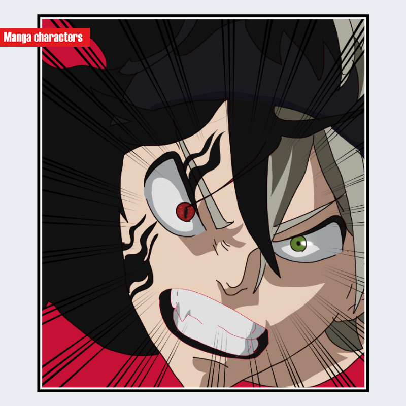 『ブラッククローバー』に登場するアスタは、左右で異なる髪色の束と顔面に走る黒い紋様が特徴的な擬人化構造のキャラクターである。髪は右側が淡色、左側が暗色のツートーン構成で、束状に斜め方向へ跳ね上がる造形となっている。目は左右で色が異なる異色構造(ヘテロクロミア型)で、瞳の形状は鋭く描かれている。頬から額にかけて黒い線状の紋様が走り、表情と連動して強い視覚的要素となっている。口元は大きく開かれ、歯列が強調される描写が確認できる。
