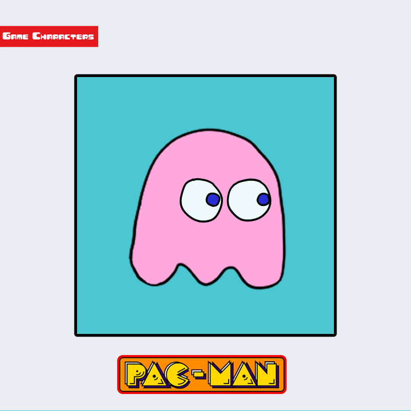 『パックマン(1980)』に登場するピンキーは、ピンク色を基調としたゴースト型キャラクターである。身体は布状の一体構造で、下部が波状に分かれている。大きな白目に青い瞳が描かれ、目の向きによって異なる印象を示す。別デザインではまつげが追加され、口元に赤い唇が描かれることで女性的な特徴が付与されている。構造分類としては「擬霊体型」に該当し、同シリーズのブリンキーやクライドと並ぶ基本的なゴースト造形の一つである。