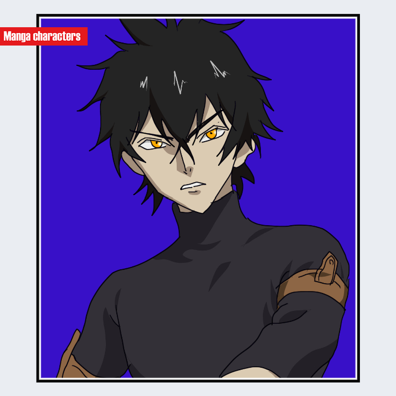 『ブラッククローバー』に登場するユノ・グリンベリオールは、外向きに広がる束状の黒髪と鋭い黄金色の瞳を特徴とする擬人化構造のキャラクターである。髪は頭頂部から放射状に外へ向かい、前髪は複数の尖ったラインとして額に垂れる構造になっている。目は細めの輪郭に黄金色の虹彩が配され、視線が強い視覚的支点となっている。上半身は黒を基調としたタイトな衣装で、肩には革帯状のパーツが装着されている。全体的に、髪型の外角と目の色の対比が造形の主要軸を構成している。