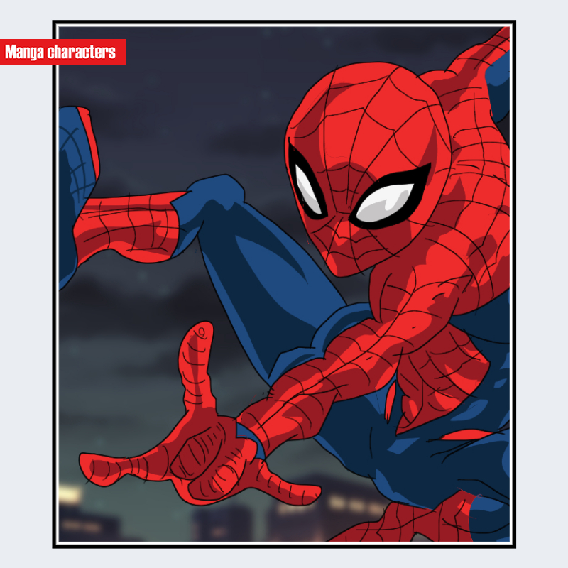 『スパイダーマン』に登場するスパイダーマンは、全身を覆う赤と青のスーツを着用し、赤部分には細かいウェブ状のラインが密に走る構造を持つ。頭部は全面マスクで、白いレンズ型の大きなアイアイコンが配置され、表情の簡略化が視覚記号として機能している。上半身の赤いパーツと青い四肢パーツの分割は一体型スーツ構造であり、装飾パーツは外付けではなく表面模様として統合されている。細身で柔軟性を強調する体格であり、動的ポーズにも適した「密着スーツ型」構造が特徴である。同作品内でも特に視覚的記号性が強いデザインとなっている。