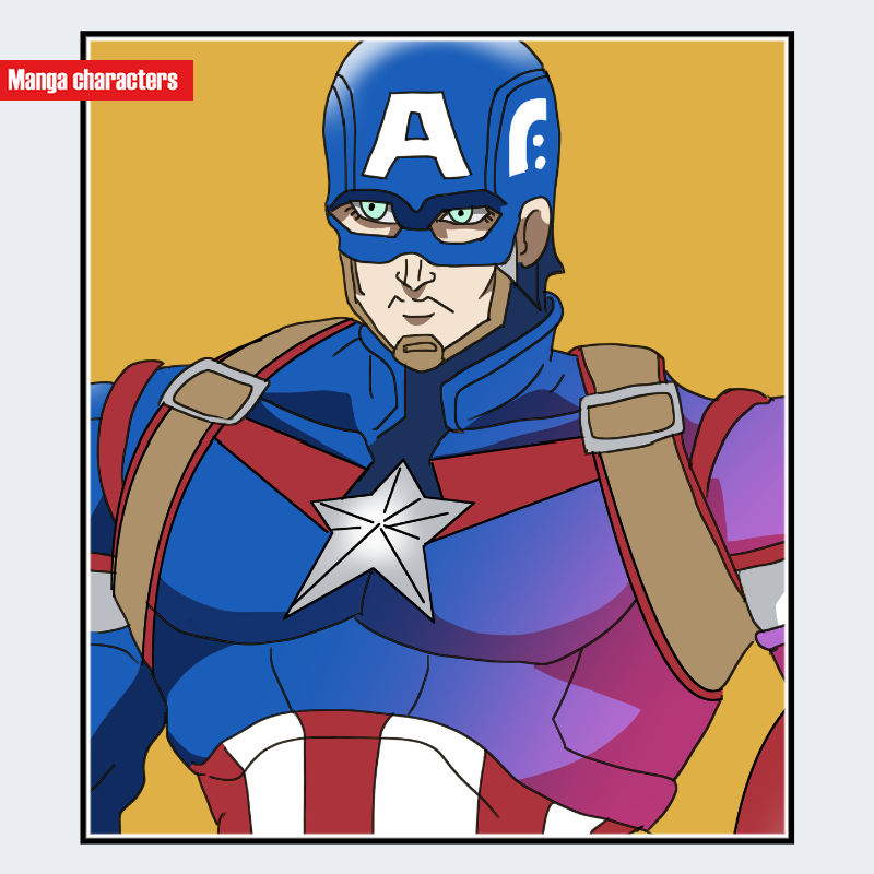 『キャプテン・アメリカ』に登場するキャプテン・アメリカは、青を基調とした上半身スーツに赤と白の配色が組み合わさった視覚的対称構造を持つ。胸部中央には大きな星型エンブレムが配置され、装飾パーツとしてストラップベルトが左右非対称に通されている。肩から胸部にかけての装甲的ラインは「防護装備融合型」に分類され、布地と硬質パーツが一体化した構造が強調されている。マスクは頭部上半分のみを覆い、目元に白いアイフレームが形成される構造が特徴である。同作品内の他キャラよりも象徴記号が大きく、外装型要素が明確に強調されている。