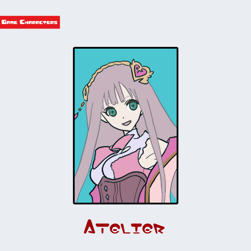 『アトリエシリーズ』に登場するルルアは、長いピンク色の髪を持ち、頭部にはハートをかたどった髪飾りを着けている。髪は前髪をまっすぐに下ろしつつ、両側に自然に流れるシルエットで構成されている。衣装は白を基調としたトップスに濃いピンクのコルセットを合わせ、肩から胸元にかけて装飾的な布の重なりが確認できる。全体として「クラシック装飾構造」と「装飾融合型」の要素が強く、華やかさを意識したデザインとなっている。