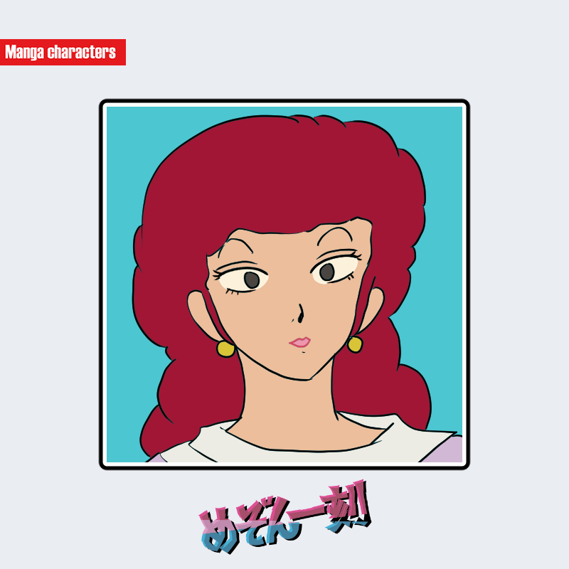 『めぞん一刻』に登場する六本木朱美は、濃い赤系の長い髪を大きなカールで後方へ流した髪型が特徴であり、輪郭に沿ってサイド部分が緩く広がる。顔立ちは細い眉と大きな瞳で構成され、耳には小さな丸型イヤリングが左右対称に装着されている。衣装は視認範囲では白系の肩見せ構造で、シンプルな布地構成が確認できる。外装的な装飾は少なく、「日常服型」の分類に該当する。同作品内の他キャラと比べても髪色とカール形状の個性が視覚的識別点となっている。