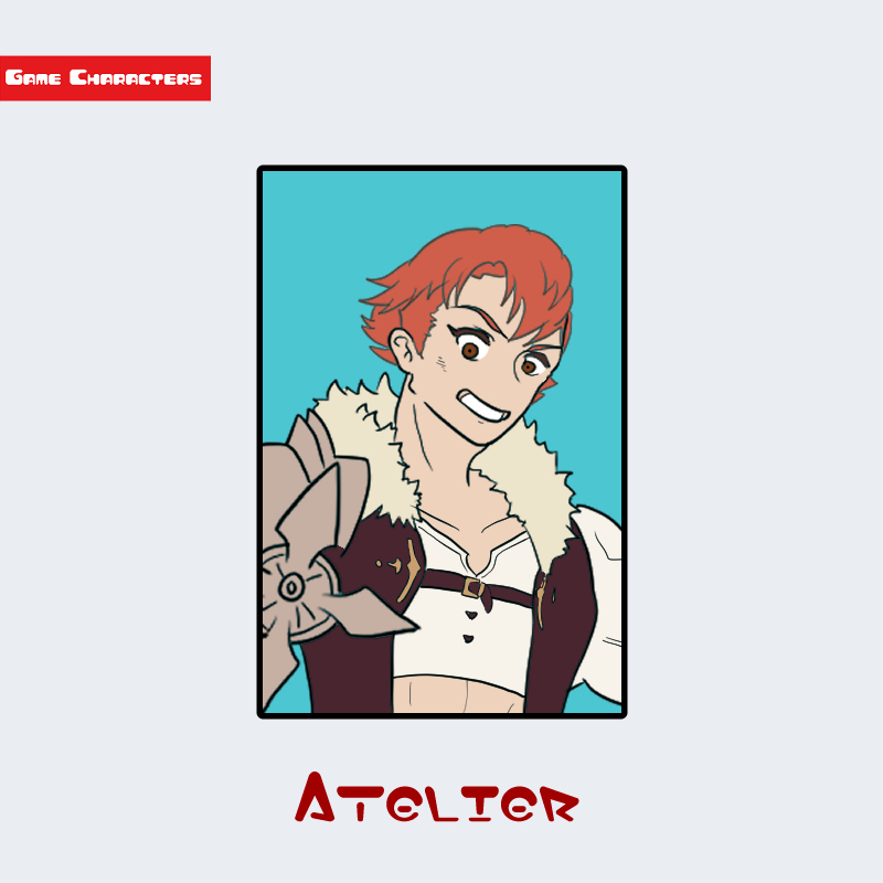 『アトリエシリーズ』に登場するレントは、短い赤みの強い髪を持ち、無造作に流れる毛束が特徴的である。衣装は白いシャツに濃色のベストを重ね、肩口にはファーの装飾が施されている。胸元は開いたデザインで、右腕には金属製の防具を装着しており、機能性と装飾性を兼ね備えた構造が確認できる。全体的に「軽装戦闘型」と「装飾融合型」の要素を含み、同シリーズにおけるより装飾寄りのキャラと比較して実用性の高い意匠となっている。