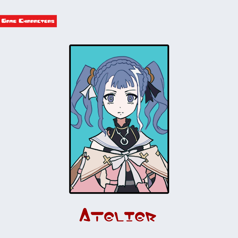 『アトリエシリーズ』に登場するパトリツィアは、青みがかった髪を二つに分け、編み込みを含むツインテール状にまとめた髪型をしている。前髪は短く整えられ、両側に長い房を垂らしている点が特徴的である。衣装は黒いインナーを基調とし、白と淡いピンクを取り入れたケープ状の外装を羽織っている。首元には円環状のアクセサリーがあり、袖口には大きなリボン装飾が確認できる。全体的に「制服融合型」と「装飾融合型」を併せ持ったデザインとなっている。