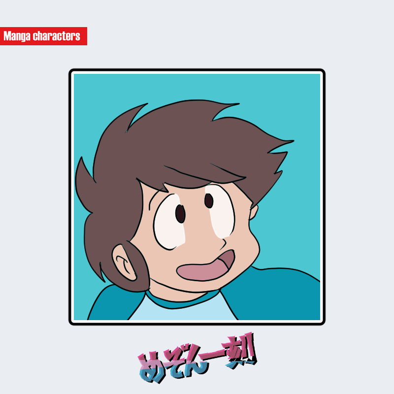 『めぞん一刻』に登場する一の瀬賢太郎は、濃い茶色系の髪を大きく流れるように外側へ跳ね上げたシルエットが特徴である。前髪は束感を伴いながら斜め方向へ流れ、頭頂部から側面にかけて量感が強調されている。丸みを帯びた輪郭に大きい楕円形の瞳が配置され、口の開き方も描線が太めの簡略構造となっている。衣装は青系のトップスで、「日常服型」の単純な布地構成が可視範囲から確認できる。髪の跳ね上がりの角度と量感が、同作品内の五代裕作との視覚的差異を作る識別点となっている。