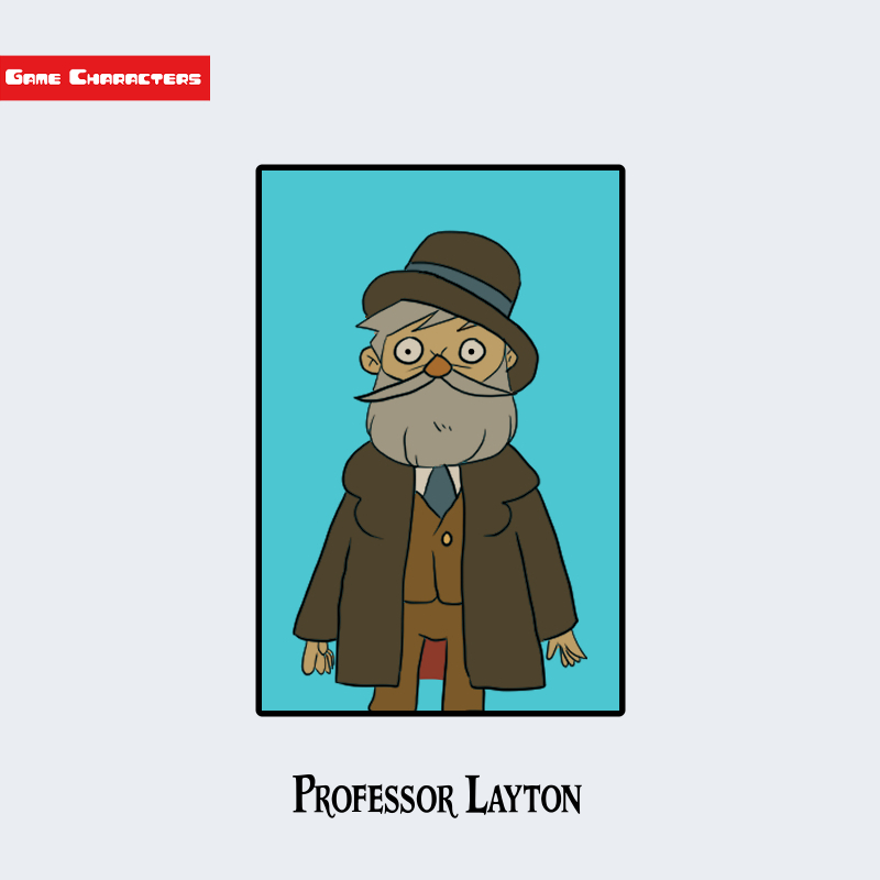 『レイトンシリーズ』に登場するシュレーダー博士は、長い灰色のひげと眉が目立つ高齢の男性キャラクターである。頭にはつば広のブラウンハットをかぶり、円形の眼鏡をかけているのが特徴的である。衣装は茶色のコートとスーツを重ねた重厚な装いで、インナーにはベストとネクタイを合わせている。全体として厚手の布地によるクラシックな服装構造を持ち、紳士的な外見を演出している。同作に登場するレイトン教授と比べても、より重厚なコートや長いひげを備えており、外見的に世代差や役割差を視覚的に強調している。構造分類としては「帽子装飾型」「クラシック衣装構造」に属する。