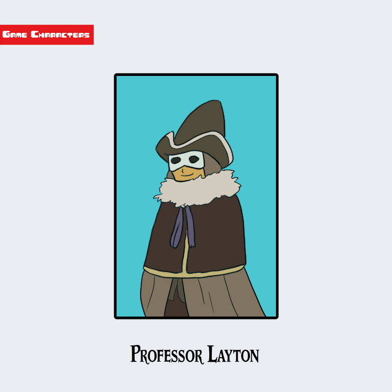 『レイトンシリーズ』に登場するジャン・デスコールは、仮面とマントを特徴とする男性キャラクターである。顔を覆う白い仮面と、大きなつばを持つ帽子を着用している。衣装は濃いブラウンのマントに白い毛皮の襟を合わせ、首元には紫色のリボンタイが結ばれている。下半身はベージュ系のパンツで、全体としてクラシカルかつ仮装的な造形を持つ。シリーズ内でも特に装飾的な構造であり、構造分類としては「仮面装飾型」に属する。