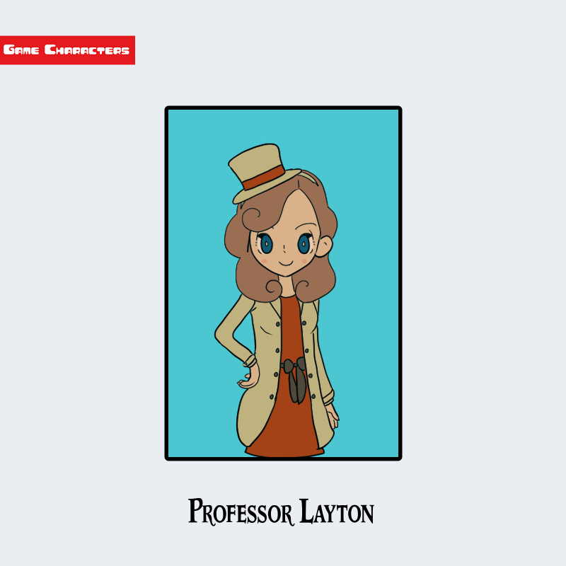 『レイトンシリーズ』に登場するカトリエイル・レイトンは、若い女性キャラクターである。髪型は明るいブラウンの長髪を大きくカールさせ、肩に垂らしたスタイルで、左右のボリュームが強調されている。衣装は赤いワンピースを基調とし、上からベージュのロングコートを羽織っている。さらに首元には黒いリボンタイを結び、頭には装飾的なベージュの帽子をかぶっている。全体的にクラシカルで整った装飾を持ち、構造分類としては「クラシカル衣装型」に属する。