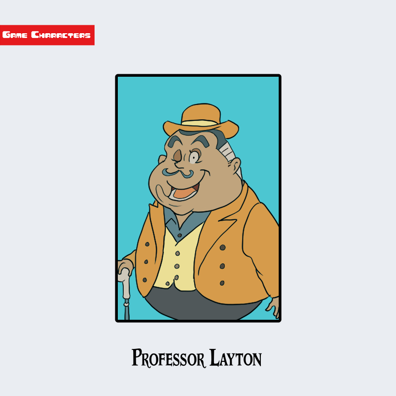 『レイトンシリーズ』に登場するクラーク・ゴスペックは、恰幅の良い体格を持つ男性キャラクターである。髪は短く整えられており、頭部には明るい色調の帽子をかぶっている。衣装はオレンジ色のジャケットにベージュのベスト、濃い色のパンツを合わせた三層構造で、胸元にはネクタイが確認できる。さらに片手には杖を持っており、装飾的かつ威厳を示す造形的要素となっている。構造分類としては「フォーマル衣装型」に属し、他キャラクターの端正なスーツ型デザインと対比される。