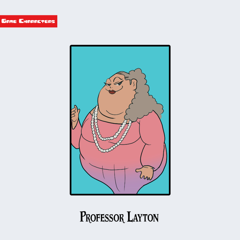 『レイトンシリーズ』に登場するスコーラ・ガルフレッツァーは、豊かな体格と装飾的な衣装を特徴とする女性キャラクターである。髪型は灰色がかった長髪を波打つように肩まで垂らしており、顔周りを強調している。衣装はピンクから紫にかけてのグラデーションのドレス風トップスで、胸元には複数重ねられた長い真珠のネックレスが際立っている。体格はふくよかで、全体的に曲線を強調するデザインが採用されている。構造分類としては「装飾衣装型」に位置づけられる。