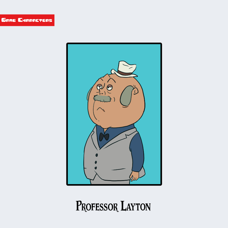 『レイトンシリーズ』に登場するヘンリー・エイザランドは、丸みを帯びた顔と大柄な体格が特徴的な男性キャラクターである。頭部には小さな白い帽子をかぶり、口ひげを備えている。衣装はグレーのベストに青いシャツを合わせ、胸元には濃色のリボンタイを付けた構造になっている。ボタン付きのベストが胴回りを強調しており、全体的にクラシカルなフォーマル風デザインが際立つ。構造分類としては「フォーマル衣装型」に分類でき、同作内の端正なスーツ姿のキャラクターと対比される外観である。