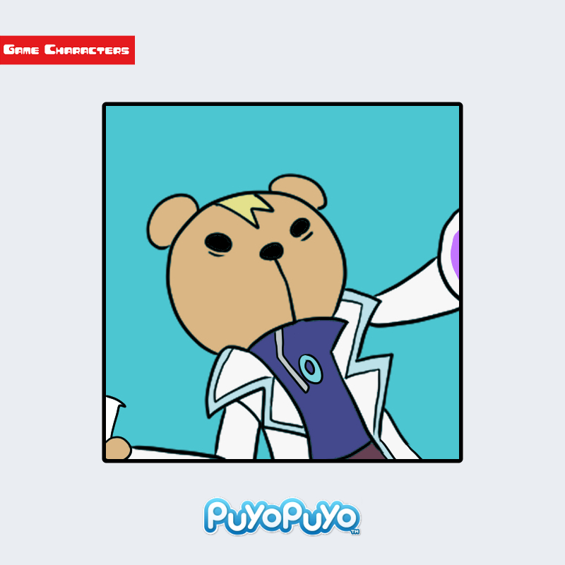『ぷよぷよシリーズ』に登場するりすくませんぱいは、クマのような頭部を持つ擬人化キャラクターである。顔はシンプルな円形構造で、耳は小さく丸い形状。額には黄色の模様があり、目と鼻は点状に描かれている。衣装は白を基調とした研究者風の上着で、首元に紫のネクタイと青の宝石装飾が確認できる。肩や袖口には幾何的ラインが入り、フォーマルな科学衣服を思わせるデザイン。「擬熊人融合型」に分類される。