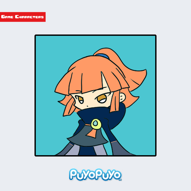 『ぷよぷよシリーズ』に登場するダークアルルは、オレンジ色の髪を持ち、前髪を一直線に切り揃えた人物型キャラクターである。髪は後方に束ねられ、全体的にコンパクトなシルエットで構成されている。衣装は濃紺を基調とし、首元を覆う大きなマント状の襟が特徴的である。胸元には円形の装飾があり、配色には青や金の差し色が加えられている。通常のアルルと比べると彩度が低く、衣装構成は「魔導服暗色派生型」に分類される。