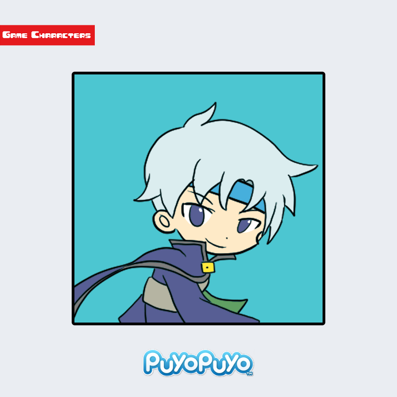 『ぷよぷよシリーズ』に登場するシェゾは、銀色がかった淡い青髪を持つ人物型キャラクターである。髪は前方にやや流し、全体的にシャープなカットラインでまとめられている。衣装は濃青を基調としたマント付きの装束で、肩口に装飾があり、首元には金色の留め具が配置されている。マントの内側には淡い紫色の裏地が見え、階層的な配色構成となっている。シリーズ内での衣装系統は魔導士風デザインであり、構造的には「魔導装束型」に分類される。