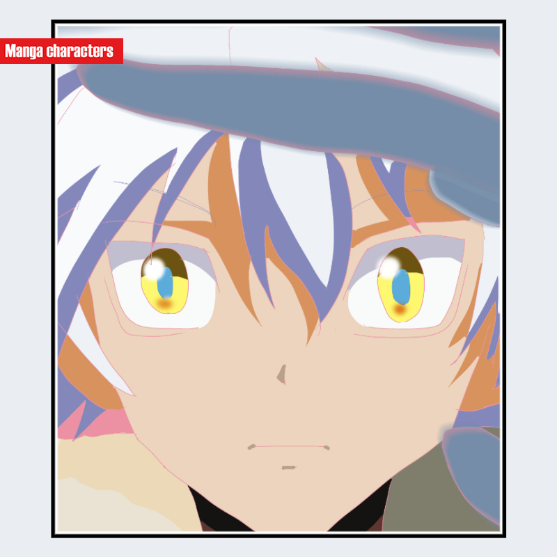 『暗殺教室』に登場する堀部糸成(ほりべ イトナ)は、白と淡い紫が混ざるような多色構成の髪を、束ごとに鋭角的に外側へ跳ねさせた特徴的なシルエットを持つ。瞳は黄色を基調に内側へ向けて濃淡の差が明確な構造で、中央の黒目が小さく配置されている。前髪は額に沿って段階的に分割され、「多束跳ね髪型」の分類に該当する。衣装の詳細は視認範囲外だが、頭部まわりの造形だけでも同作品内で強い識別力を持つデザインとなっている。