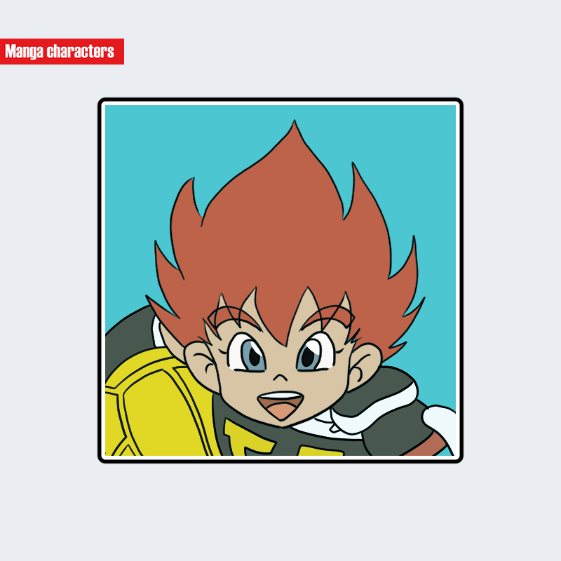 『炎の闘球児ドッジ弾平』に登場する一撃弾平は、明るい橙色系の髪を大きく尖らせたシルエットが特徴で、頭頂から外側へ放射状に広がる「多方向スパイク型」の髪構造となっている。前髪は額に向かって短く折れ込み、全体の束感が強調されている。瞳は大きく丸型で、黒目が中央に配置されたシンプルな描線構造である。衣装は視認範囲では黄色と黒を基調としたスポーツ用のトップスで、肩にプロテクター状の外付けパーツが確認できる。少年キャラに多い軽量装備型デザインで、動きのある髪型が同作品内の識別点となる。