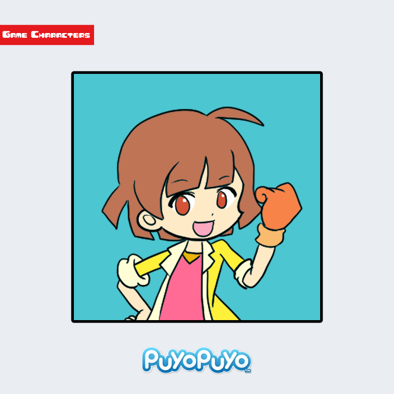 『ぷよぷよシリーズ』に登場するあたりは、短く整えられた茶色の髪と、赤みのあるシャツに黄色のジャケットを合わせた明るい配色構成が特徴のキャラクターである。手にはオレンジ色のグローブを着用しており、身体動作の強調やスポーティな印象を与える要素となっている。衣装全体はカジュアルながらも統一感のある設計で、袖口や首元の白がアクセントとして機能している。シリーズ内の他キャラと比較しても、魔法衣装ではなく現代的なアウター構造を持つ点が異質で、「現代服融合型」に分類される。