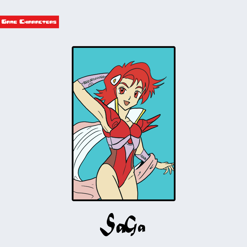 『時空の覇者 Sa・Ga3』に登場するシリューは、赤髪を短くまとめた軽快なヘアスタイルと、肩を大きく露出させた衣装構造が特徴の女性キャラクターである。衣装は赤を基調としたボディスーツ型で、胸部に白と紫の装飾パーツが重ねられている。背面には白い翼状の布装飾が確認でき、全体として動的かつ舞踏的な造形構成を持つ。身体のラインに密着するデザインながら、肩や腕の可動性を確保した設計である。構造分類としては「軽装装飾型」に属する。