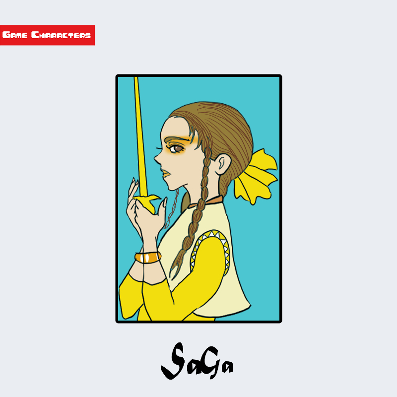 『ロマンシング サ・ガ3』に登場するサラ・カーソンは、茶色の髪を三つ編みにまとめ、後頭部に大きな黄色のリボンを結んだ姿が特徴的な女性キャラクターである。衣装は黄色を基調とし、袖口や肩のラインに細かな装飾が施されている。上半身には軽装のチュニック構造を採用し、機能性と動きやすさを両立させている。全体として布地と装飾の調和が取れたシンプルな造形で、構造分類としては「軽装行動型」に属する。