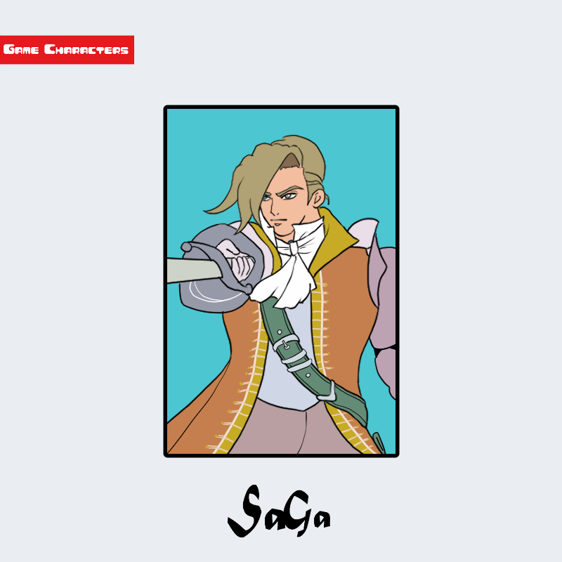 『サガ フロンティア2』に登場するケルヴィンは、金髪を長めに流し、片側を大きく分けた整った髪型が特徴の男性キャラクター。上半身には装飾的な縁取りのあるコートを着用し、インナーには白いフリルシャツを合わせている。胸元を覆うような大襟と、斜めにかけたベルト状の装備がアクセントになっており、全体として騎士的要素と貴族的意匠を併せ持つ。手には細身の剣を構え、上半身の造形に直線的な緊張感が生じている。構造分類としては「貴族戦装型」に属する。