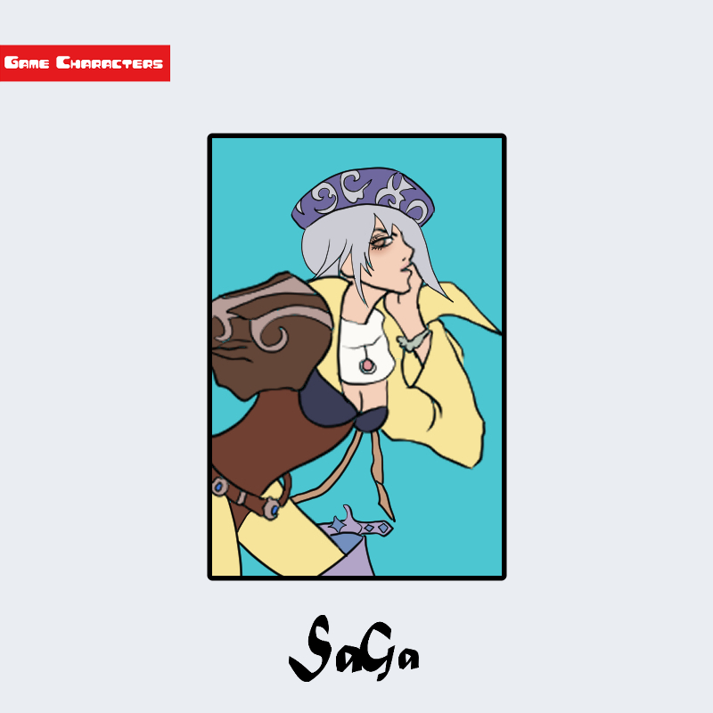 『サガ フロンティア2』に登場するエレノアは、銀髪を肩口でまとめ、特徴的なベレー帽を被った上品な外見を持つキャラクター。上半身は胸元の開いた衣装に大きなマント風の布地を重ねており、肩部に立体的な装飾パーツを備えている。衣装全体は柔らかい布素材と硬質装飾の対比が明確で、造形の陰影を強調するデザイン構造となっている。腰回りにはベルト状のアクセントが見られ、上半身中心の視線誘導が設計的に意図されている。構造分類としては「マント装飾型」に属する。