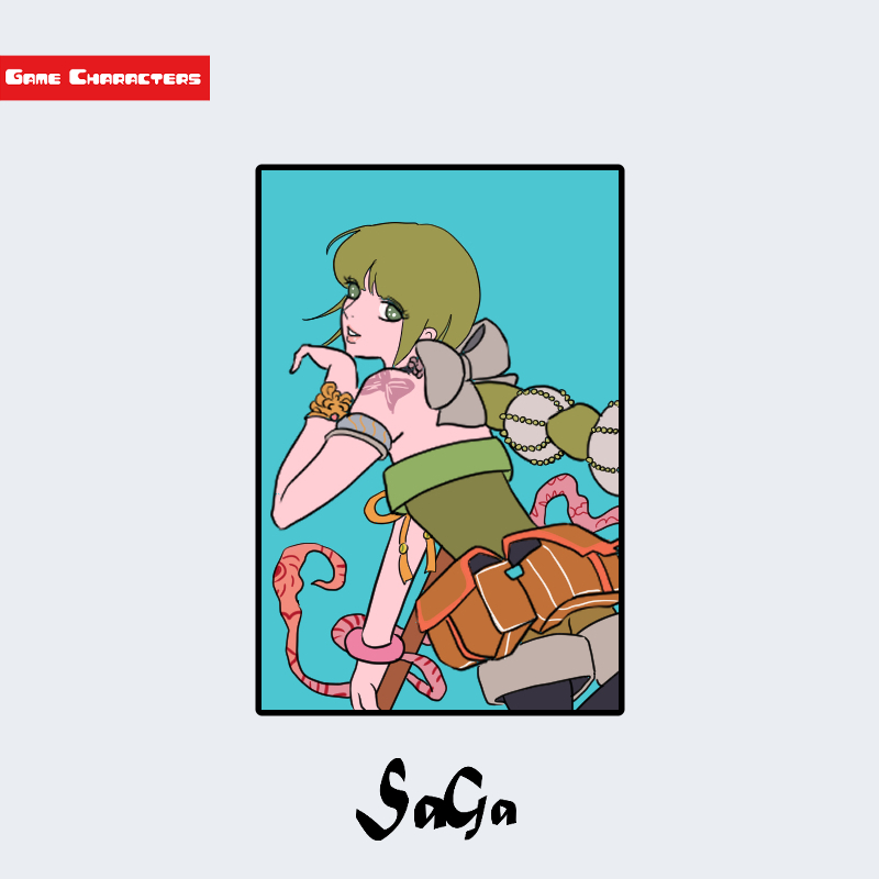 『サガ フロンティア2』に登場するヴァージニア・ナイツは、明るい緑の髪をまとめ、背面に大きなリボンを結んだ華やかなデザインが特徴の女性キャラクター。上半身は淡いトーンのトップスで軽装気味ながら、腰部にはベルトと多層構造のスカートを組み合わせている。全体的に装飾紐やリボンを多用した構造で、冒険者的要素と少女的意匠を融合させた衣装バランスが取られている。リボンや帯の結び方が立体的で、動きのある造形を強調する造形設計。構造分類としては「装飾融合型」に属する。