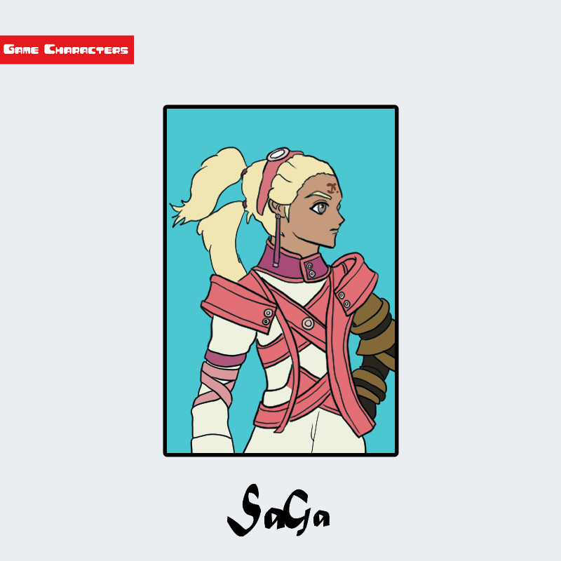 『アンリミテッド:サガ』に登場するマイスは、金髪を高い位置で束ねたポニーテールの女性キャラクターで、上半身を覆うピンク系の装甲的衣装が特徴である。肩から胸にかけては硬質素材のプレート状構造で、白いインナーと組み合わされている。右腕には黒と金の帯状装飾が施され、全体的に左右非対称のデザインが強調されている。首元には高いカラーガードが設けられ、機能性と造形美を兼ね備えた「軽装防具型」に分類される。