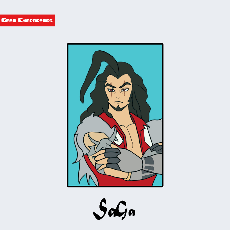 『サガ スカーレット グレイス』に登場するバルマンテは、黒髪を高く束ねた逆立つような髪型と、鋭角的な輪郭が特徴的な男性キャラクターである。上半身には灰色の鋼鉄風パーツを肩から装着し、赤を差し色にした服装が戦闘的な印象を与える。胸元が大きく開いた衣装構造は「鎧融合型」に分類され、同作のウルピナの儀礼的衣装と対照的なデザインである。両腕を組む姿勢が視覚的に重心の強さを際立たせている。
