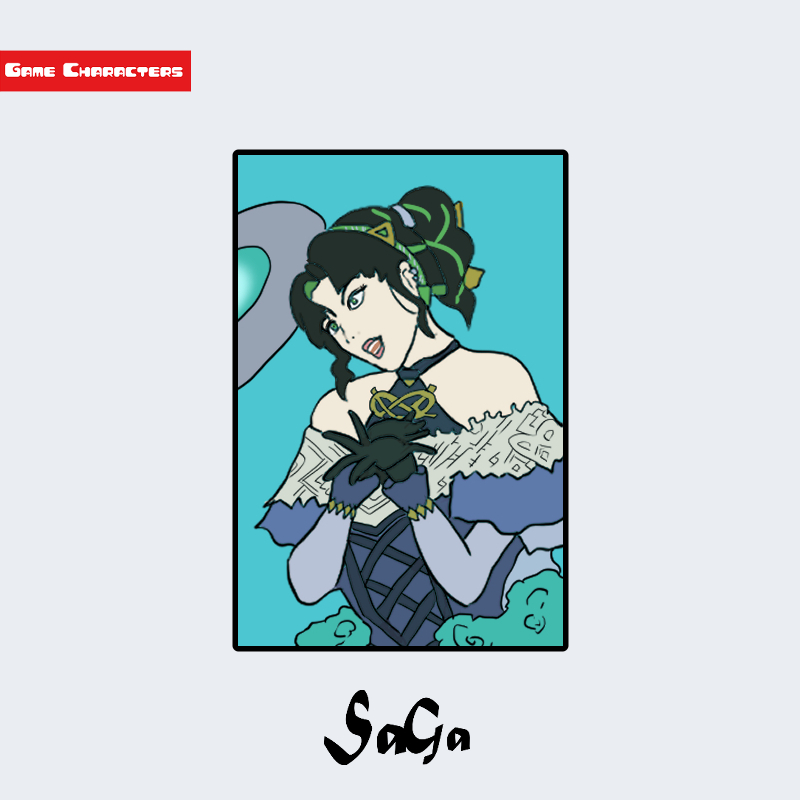 『サガ エメラルド ビヨンド』に登場するディーヴァ・ナンバー5は、深緑系の髪を高くまとめた華やかなシルエットを持ち、背部には機械的な装置の一部が見えるキャラクターである。衣装は白と青を基調としたドレス型構造で、肩から腕にかけてはフリルと装飾レースが重なっている。胸元のリボンや金色のアクセントが強調され、機械的要素と舞台衣装的意匠が融合した造形が特徴。肌の露出と構造線の明確さから、メカニカルと人間的要素の境界を意識したハイブリッド衣装型といえる。