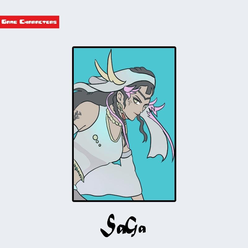 『ロマンシング サガ リ・ユニバース』に登場するマドレーンは、白を基調とした衣装に金属装飾を組み合わせた女性キャラクターである。頭部には白い布状のヘッドアクセサリーが巻かれ、背面に金色の装飾パーツが立ち上がる。髪は黒とピンクのグラデーションで、前髪を分けた流線的なデザインが特徴。首元から腕にかけては金属や宝飾風のアクセサリーが配置され、身体全体の輪郭を強調している。衣装と装飾が一体化した「装飾融合型」として分類できる。