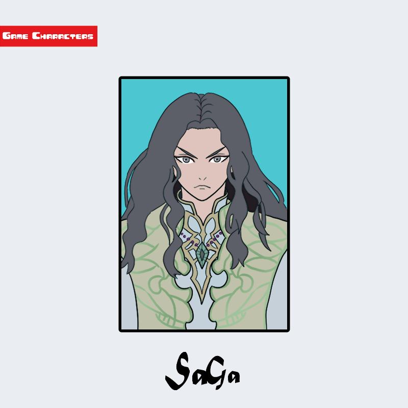 『ロマンシング サ・ガ2』に登場するワグナスは、長く流れる黒髪と鋭い眼差しを特徴とするキャラクターである。衣装は淡い緑を基調とし、胸元には複雑な装飾を施した宝石のような意匠が確認できる。肩口から胸にかけて広がるデザインは、王族的な荘厳さと異形的な威厳を兼ね備えている。全体的に直線的な輪郭が強調されており、髪の波打ちとの対比が視覚的な印象を際立たせる。構造分類としては「貴族装束型」「人間強化構造」に該当する。