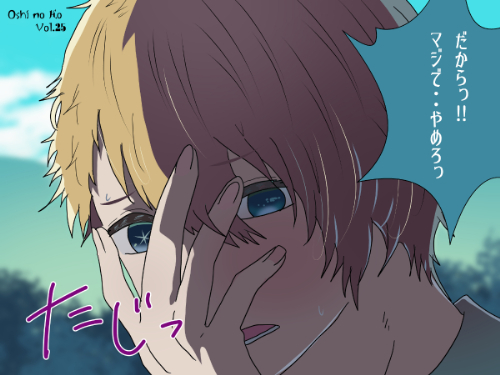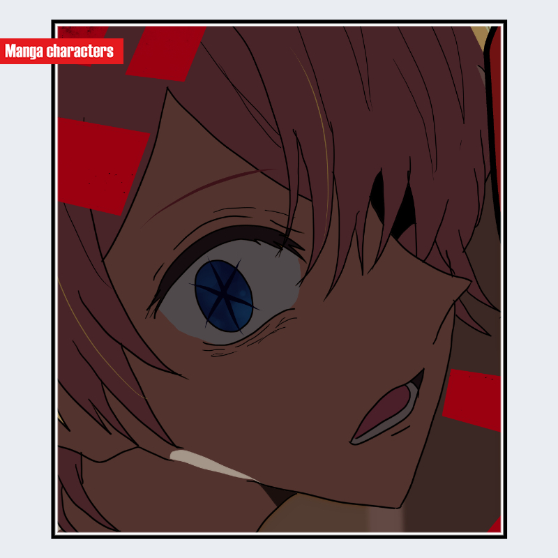 『推しの子』に登場する星野愛久愛海(あくあまりん)は、淡い桃色系の髪を前方に大きく流した「前方偏重束構造」の髪型を持ち、前髪は額を斜めに覆う非対称配置となっている。瞳は濃い青を基調とし、中心部に星型の視覚記号が組み込まれた多層彩色構造が特徴である。顔立ちはシャープな描線で、目元と口元の開口角度が強調されている。衣装は視認できない範囲が多いものの、襟元に白シャツと黒系ジャケットが重なる「日常服型×フォーマル寄り」の布地構造が確認できる。長めの側面髪束と星型ハイライトが同作品内でも強い識別点となる。