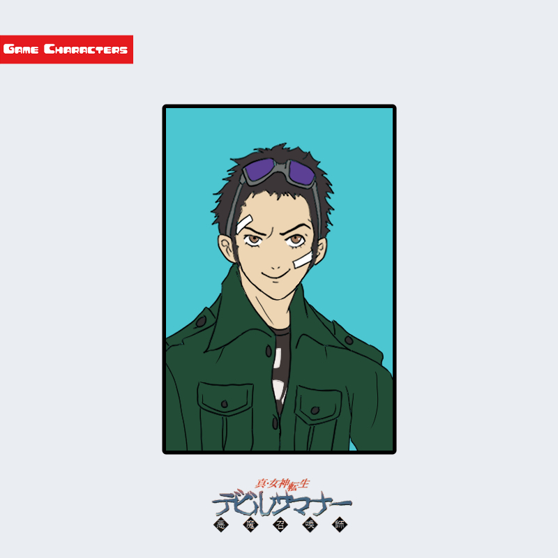 『ソウルハッカーズ』に登場する主人公は、短く整えられた黒髪と額に巻かれたゴーグルを特徴とする青年キャラクターである。右頬に白いテープが貼られ、活動的な印象を与える造形となっている。衣装は深緑色のジャケットを基調とし、胸部に2つのポケットが配置された実用的なデザイン。襟元は立て襟構造で、全体に直線的なフォルムを持つ。視覚構造上、#機能融合型 構造に分類され、シリーズ内の他キャラ(例:ネミッサ、スプーキー)と比較して現実寄りの衣装設計が際立っている。