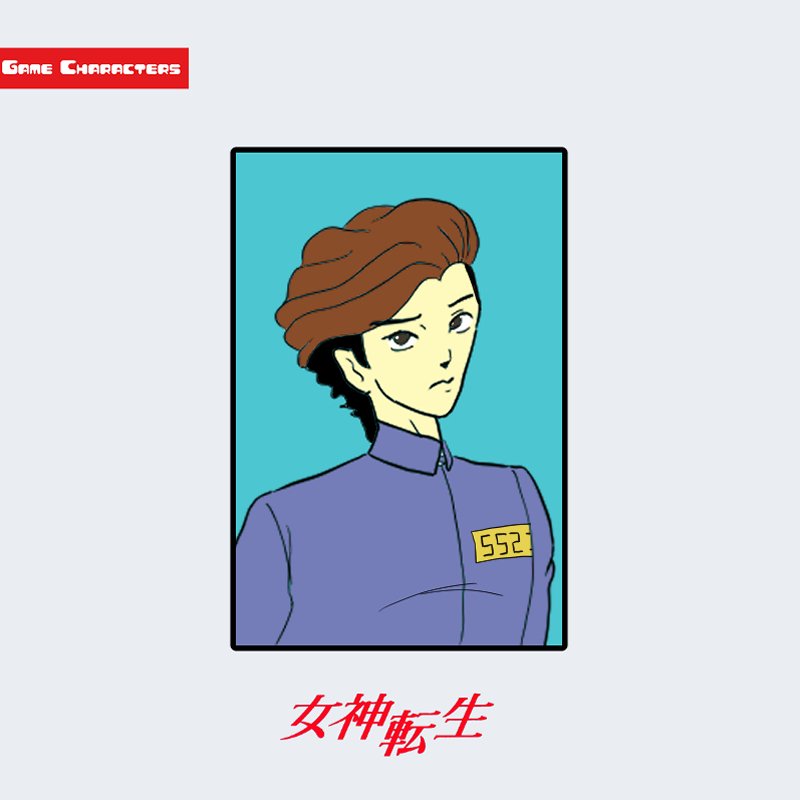 『デジタル・デビル物語 女神転生II』に登場する主人公は、整った顔立ちとやや長めの茶髪を特徴とする男性キャラクターである。髪は前方に流れるウェーブ状で、全体的に柔らかい動きを持たせた造形となっている。衣装は薄紫のジャンプスーツで、胸部には「552」と記された識別番号が付いている。直線的なラインを多用した衣装構造は、機能性を意識した設計であり、シリーズ初期のSF的要素を反映している。「制服融合型」および「機能装備構造」に分類される。