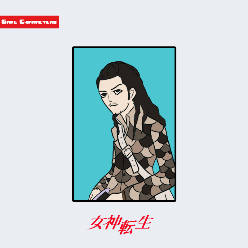 『真・女神転生III-NOCTURNE』に登場する聖丈二は、長髪を後方に流した姿が特徴的な男性である。髪は黒く、前髪を左右に分けた整ったスタイルで、顔立ちは細く引き締まっている。衣装はスケイル状の模様を持つジャケットで構成され、全体的に有機的な曲線を多用したデザインとなっている。複雑な模様が身体のラインに沿うよう配置され、視覚的に独特な層構造を形成している。構造分類としては「有機装束型/鱗文融合構造」に属する。