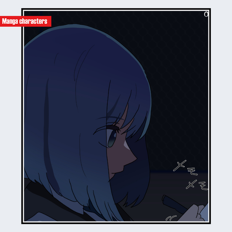 『推しの子』に登場する黒川あかねは、青みがかった淡い水色系の髪色を持ち、肩付近で切りそろえられた「短中距離ボブ型」の髪構造をしている。前髪は細い束で分割され、目元に沿って斜めに落ちる形状となっている。瞳は緑寄りの薄い色調で、星型のハイライトが入った多層的な彩色構造が特徴である。制服は白シャツに濃色のベストを重ね、リボンを加えた「制服融合型」の衣装構造となっている。側面カットのシーンでは暗所での彩度が低く、シルエットの輪郭が視覚記号として強調される。