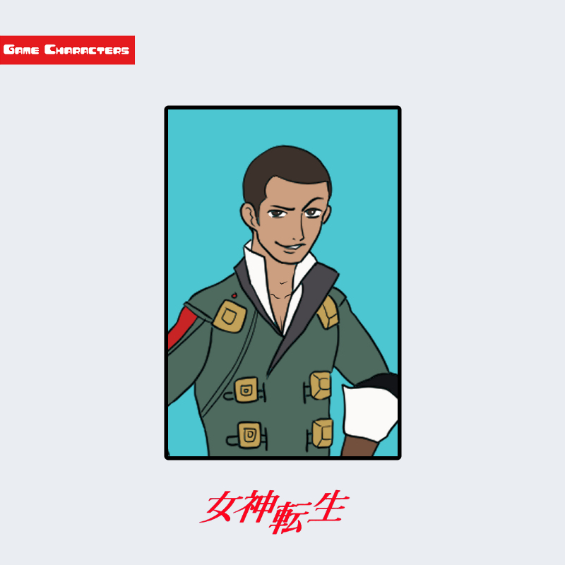 『真・女神転生 STRANGE JOURNEY』に登場するヒメネスは、短く整えた黒髪と精悍な顔立ちを持つ男性である。衣装は深緑色の軍装風ジャケットで、襟元を大きく開き、白いインナーがのぞく構造になっている。肩や胸部にはベルト留めや赤いパッチが施され、機能性と個人差を併せ持つ設計が特徴である。同作品に登場する他の隊員装備と比較しても、より軽装かつ行動性を意識した制服融合型のデザインといえる。