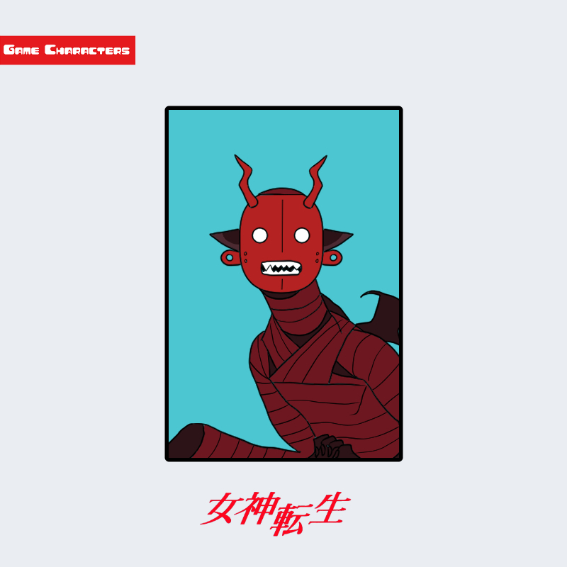 『真・女神転生 STRANGE JOURNEY』に登場するバガブーは、赤い肌と尖った二本の角を持つ小柄な悪魔的存在である。目は白く大きく見開かれ、口には鋭い歯が並ぶ。体全体は包帯状の布で巻かれており、露出した肌の赤とのコントラストが強い。耳は外側に広がる形で突き出しており、全体として人型に近いが異形要素が強い擬人化構造を有している。
