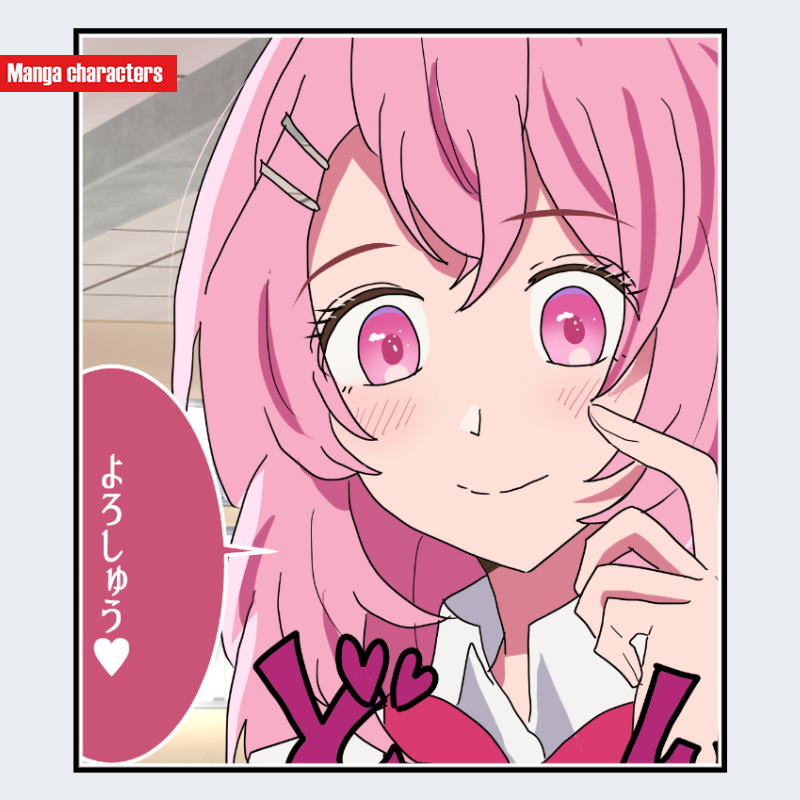 『推しの子』に登場する寿みなみは、鮮やかなピンク系の髪を肩下まで伸ばした「長髪ゆるカール型」の髪構造を持ち、前髪は細い束で均等に下ろされている。側頭部からの外向きの毛束が特徴で、全体的に軽いウェーブがかかっている。瞳は高彩度のピンクで、中心に向かって明度の差がついたアニメ特有の多層彩色構造が確認できる。制服は白いシャツに大きなピンクのリボンを合わせた「制服融合型」の構造で、髪色との相性が視覚的に強い印象を与える。髪色・瞳色の高彩度コンビネーションが特に識別性の高い要素となる。