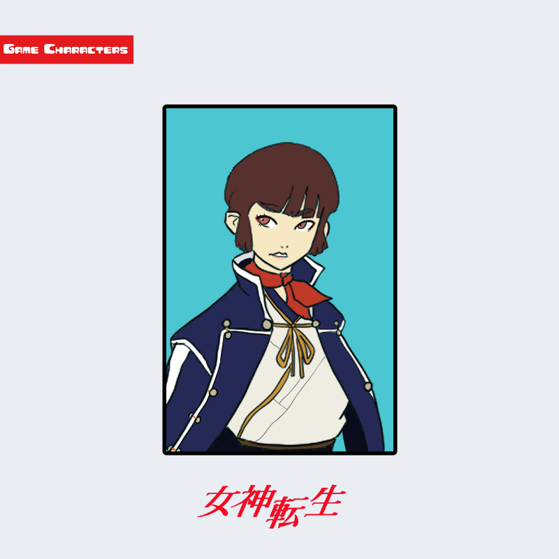 『真・女神転生IV』に登場するイザボーは、濃紺の外套と白のインナーを組み合わせた制服調の衣装を着用する女性キャラクターである。首元には赤いリボンタイが結ばれており、全体に整った幾何構成が見られる。髪型は前髪を短くそろえたボブカットで、後部はすっきりとまとめられている。衣装の装飾は金色のボタンや縁取りによって強調され、秩序と規律を象徴する意匠となっている。同作の他キャラ(例:ガストン)の軍装寄りデザインと比較すると、より儀礼的・学術的な要素が強い。構造分類としては「制服融合型」に該当する。