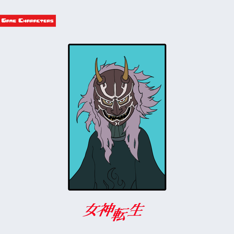 『真・女神転生IV FINAL』に登場するトキは、鬼面を模した仮面と長い淡紫色の髪を持つキャラクターである。仮面には角状の突起が二本あり、眼の部分に鋭い模様が描かれているのが特徴的。衣装は全体的に暗色で統一され、ゆったりとした上衣が身体を覆っている。仮面と髪の対比によって人物像の人間性と異形性の両面が強調されており、造形的には「擬装融合型」に分類される。アサヒやノゾミなど他キャラの開放的な装備デザインとは対照的に、遮蔽と象徴性を兼ねた構造をもつ。