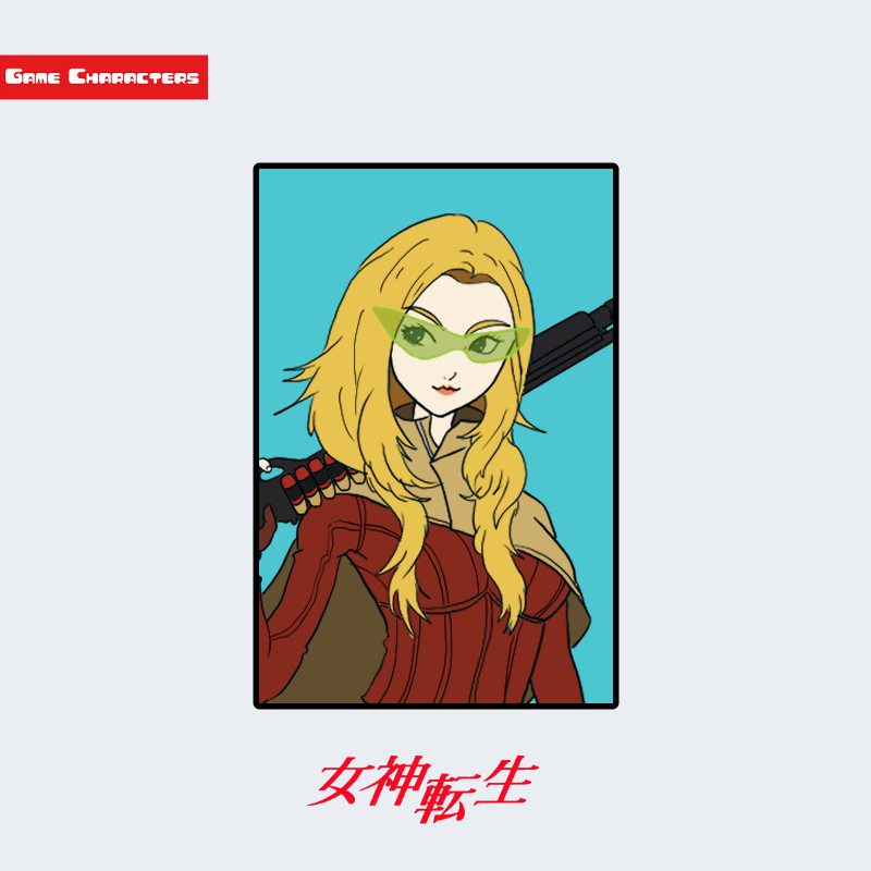 『真・女神転生IV FINAL』に登場するノゾミは、長い金髪と鮮やかな緑のアイマスクを特徴とする女性キャラクターである。深い赤のジャケットに黒いインナーを重ねた衣装構成は、防御性と機動性を両立させた実用的デザインとなっている。背中には黒い武装装備が確認でき、戦闘準備を意識した造形構造がうかがえる。髪型はウェーブを帯びたロングスタイルで、視覚的にも強い印象を与える。構造分類としては「戦闘装備融合型」に該当する。