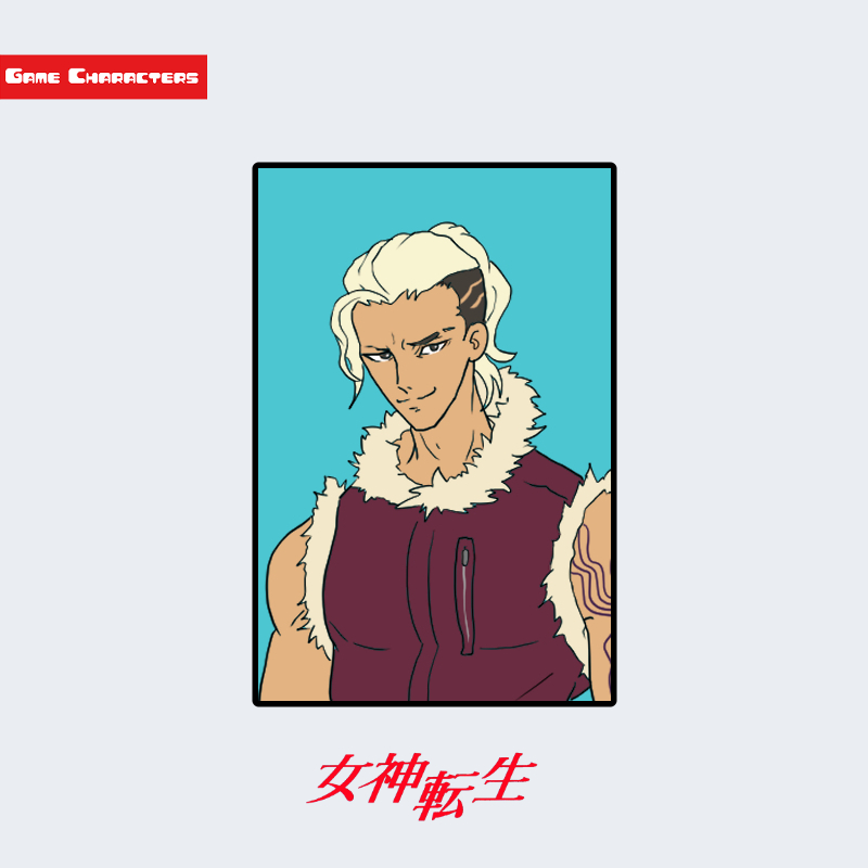 『D×2 真・女神転生 リベレーション』に登場する蔡正雲は、片側を刈り上げたアシンメトリーな髪型が特徴的な男性キャラクターである。髪色は明るい金髪で、長く垂れた前髪が左側に流れる造形を持つ。衣装は肩を露出したノースリーブのファージャケットで、襟元には厚手の白い毛皮装飾が施されている。胸元のジッパーラインや腕のタトゥー的模様がアクセントとなり、全体として「ストリート戦闘型」の構造分類に属する。