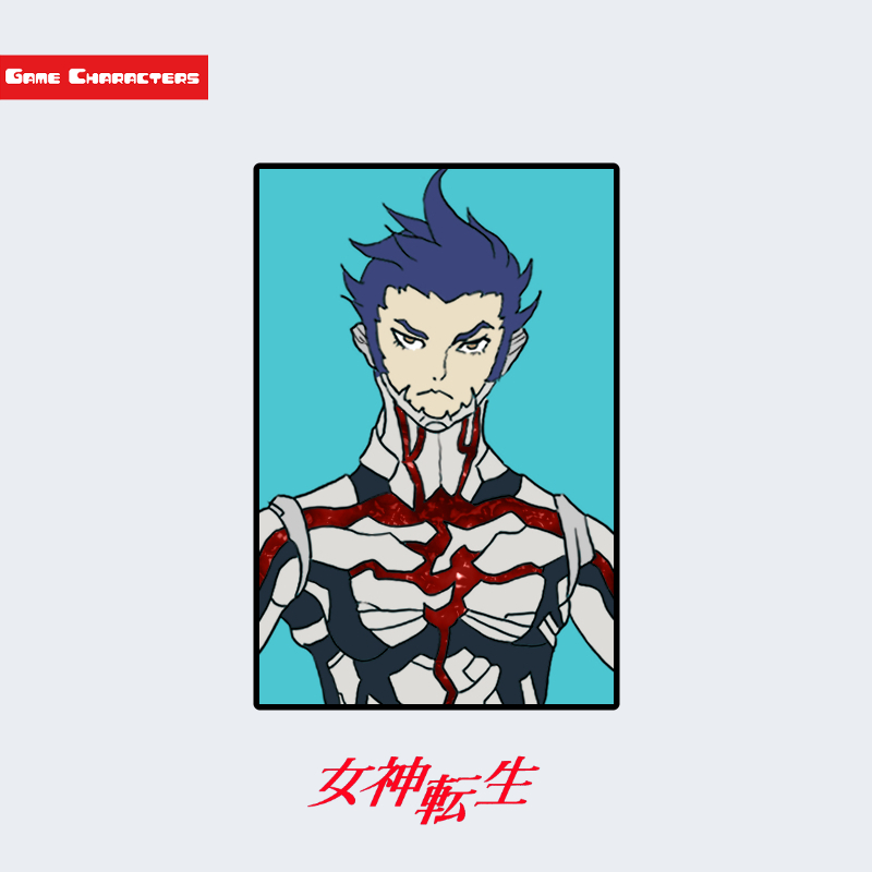 『真・女神転生V』に登場するアオガミは、白と紺を基調とした装甲状の身体構造を持ち、表面には赤い紋様が筋肉のように走っている。髪は青く逆立ち、全体として人型のバランスを保ちながらも人工的な質感が強い。胸部から腹部にかけては金属的なパネル構造が層状に組み合わされ、首元からの赤いラインが有機的な流れを形成している。肩や腕部は硬質なパーツで覆われ、機械的な印象を与える。構造的には「擬人化融合型」に分類され、人間と神的存在の造形融合を示すデザインである。